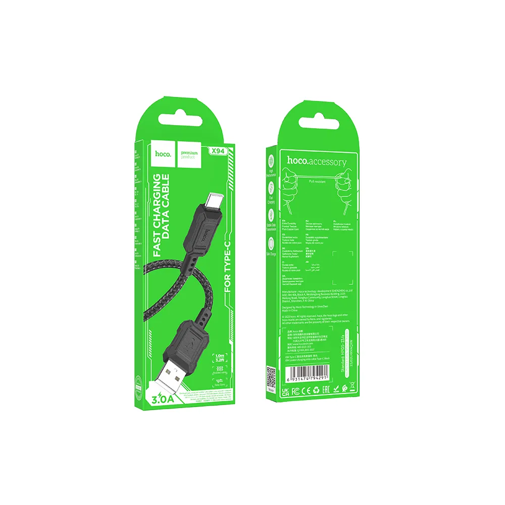 Cavo Hoco Leader X94 con connettore USB -A – USB -C. Supporta la ricarica e la trasmissione dati. È dotato di una robusta treccia in PVC e di una struttura rinforzata.